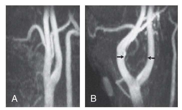 Arteriography-Shows the carotid bifurcation to be splayed open by the mass which is rich in vascularity