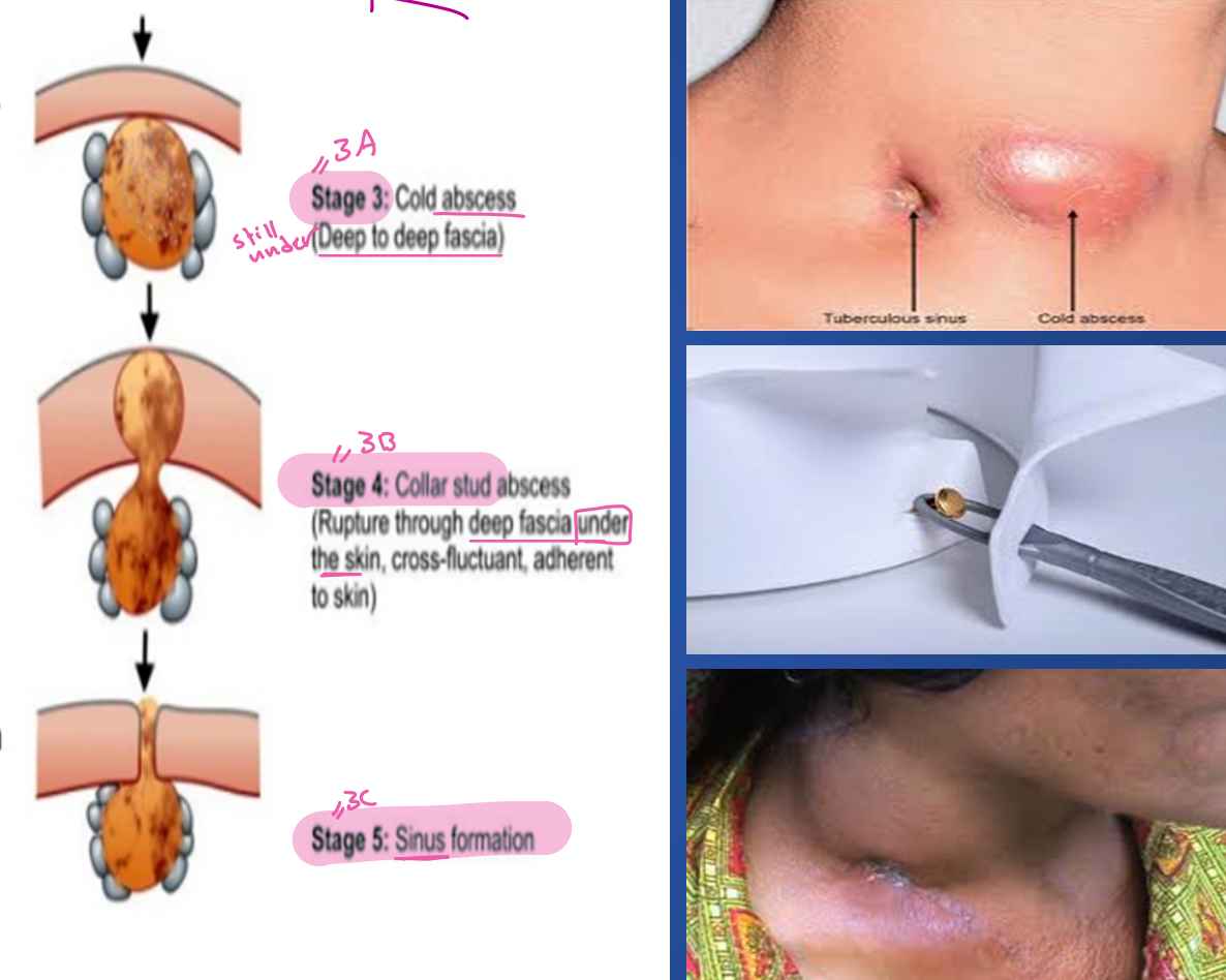 • Left untreated, as a result of increased pressure, cold abscess ruptures out of the deep fascia to form collar stud abscess which is adherent to the overlying skin.