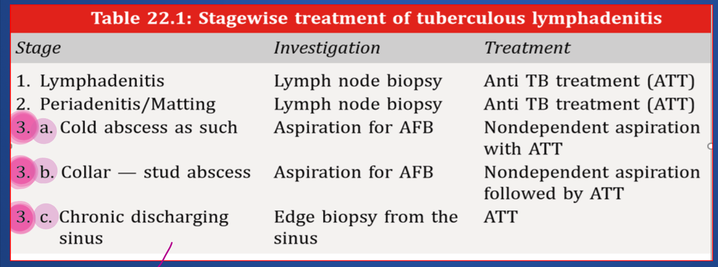 Role of Surgery in TB lymphadenitis if there’s bad signs z i. Biopsy-Lymph node biopsy, edge biopsy from the edge of the sinus. ii. Aspiration-Non dependent aspiration of cold abscess. iii. Excision of the lymph nodes, if they persist in spite of ATT. iv. Excision of the sinus along with the tract.