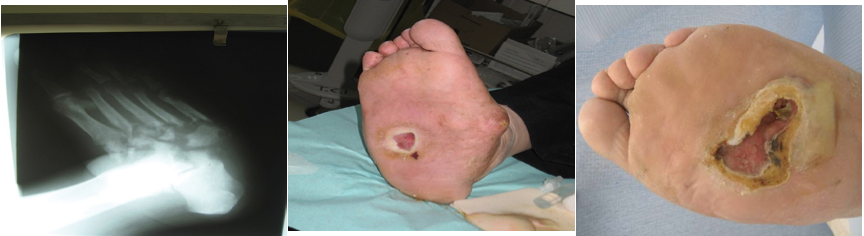 Classic Charcot’s mid-foot ulcer following collapse of the foot arches.