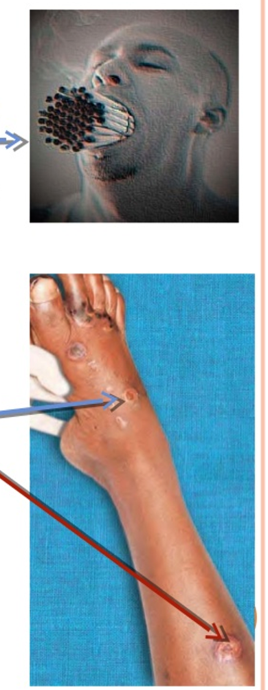 Smoking Causes vasospasm and hyperplasia of intima ↓ Thrombosis and obliteration of vessels occur, commonly medium sized vessels are involved ↓ Panarteritis is common. Usually involvement is segmental Eventually artery, vein and nerve are together involved ↓ Nerve involvement causes rest pain Patient presents with features of ischaemia in the limb ↓ If patient continues to smoke, disease progresses into the collaterals, blocking them eventually, leading to severe ischaemia and is called as decompensatory peripheral vascular disease.