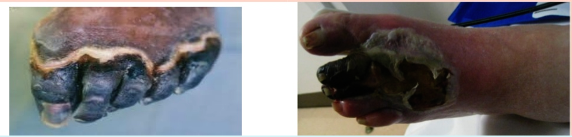 | Symptoms | Cold temp., dull aching pain Skin changes colour to dark brown → dark purplish → completely dark | Offensive odor Swollen, red and warm |
