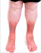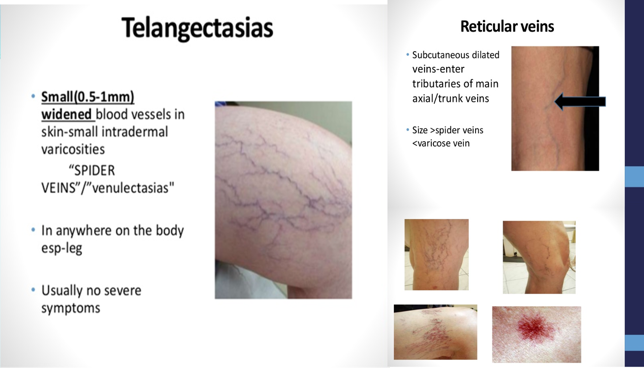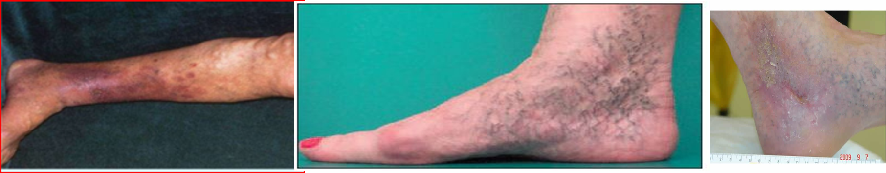 Features of chronic venous insufficiency (CVI): Oedema, leg induration, pigmentation, eczema, ulceration, skin thickness & redness- lipodermatosclerosis