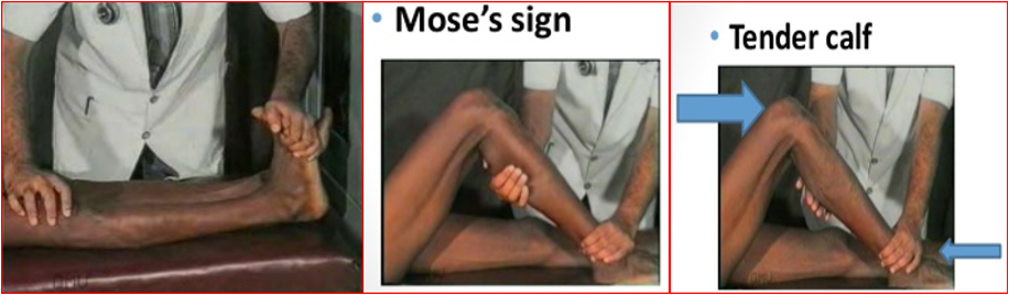 - Homan’s sign- stretching calf by foot dorsiflexion causes pain