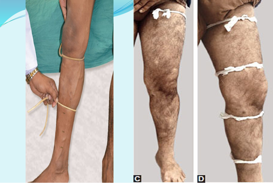 - An elastic tourniquet applied at the sapheno-femoral junction