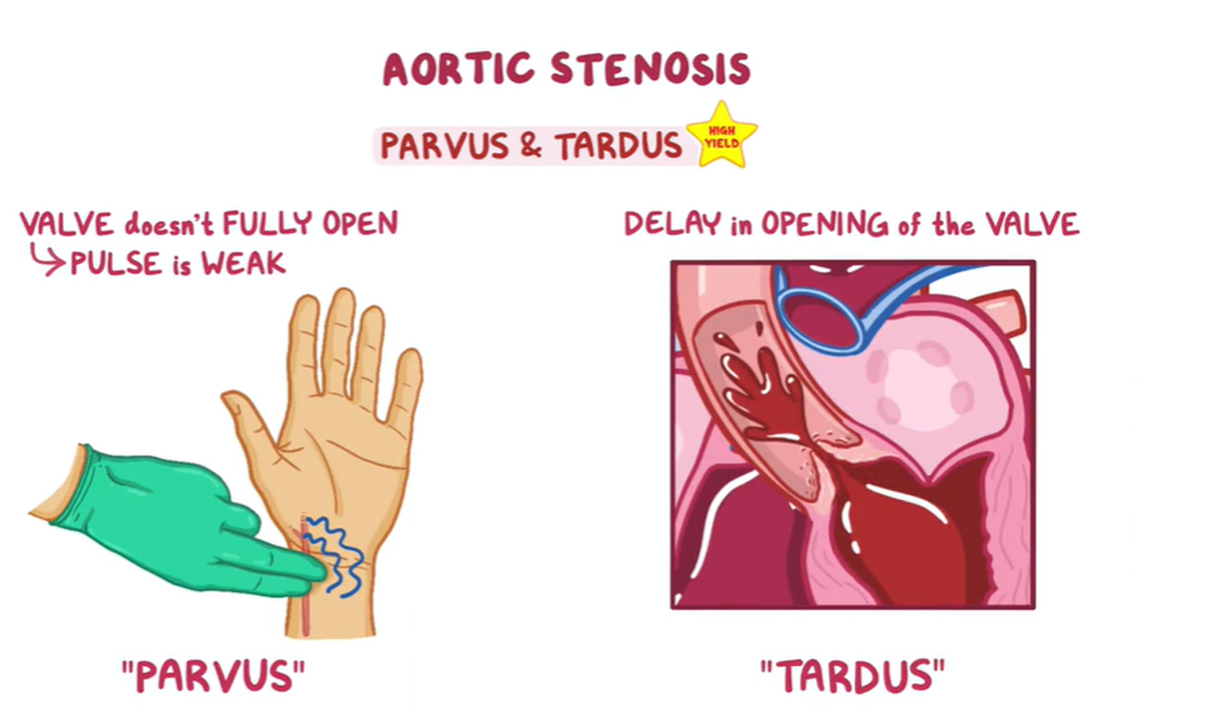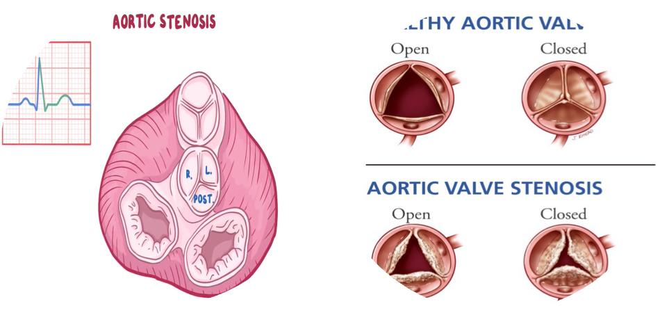 Narrowed opening area of the aortic valve during systole → obstruction of blood flow from the left ventricle (LV) → increased LV pressure → left ventricular concentric hypertrophy, which leads to: Increased LV oxygen demand. Impaired ventricular filling during diastole → left heart failure. Reduced coronary flow reserve. Initially, cardiac output (CO) can be maintained. Later, the decreased distensibility of the left ventricle reduces cardiac output and may then cause backflow into the pulmonary veins and capillaries → higher afterload (pulmonic pressure) on the right heart → right heart failure.