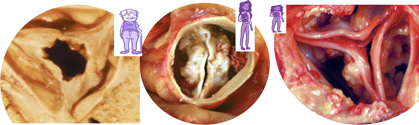 • Bicuspid aortic valve (BAV): Fusion leaflets in utero. C: males (3:1). Dystrophic calcification and degeneration. Associated with A coarctation, root dilation & A dissection. Symptoms of AS: earlier than in regular aortic valve calcification.