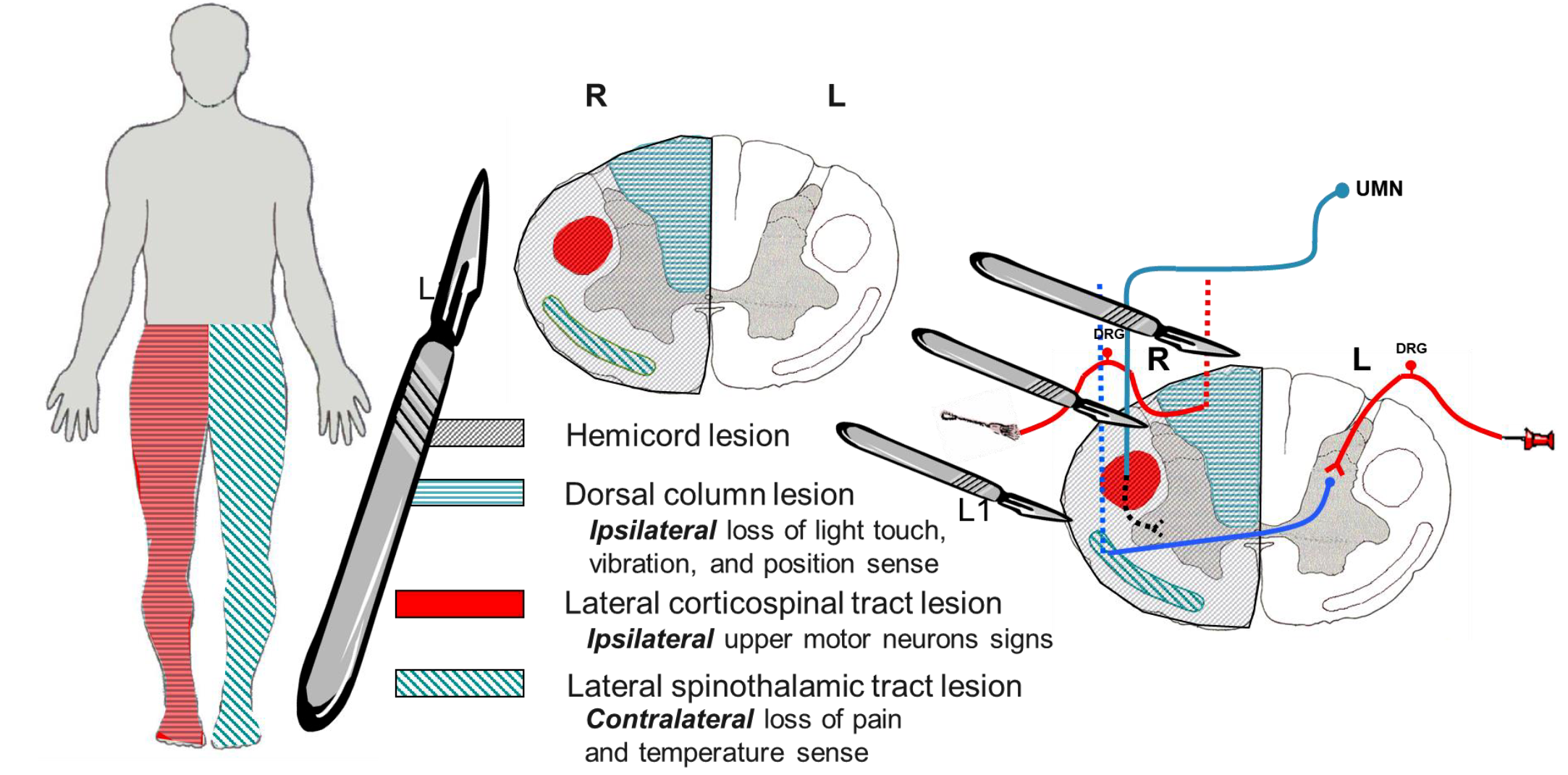 Dorsal column lesion – Ipsilateral loss of light touch, vibration, and position sense Lateral corticospinal tract lesion – Ipsilateral upper motor neurons signs Lateral spinothalamic tract lesion – Contralateral loss of pain and temperature sense