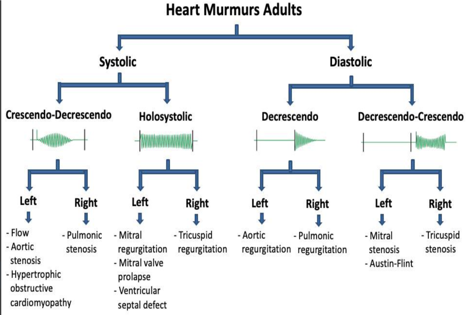 | (Holosystolic/Pansystolic) MR = mitral regurgitation TR = tricuspid regurgitation VSD = ventricular septal defect | (Mid-late Diastolic/ decrescendo- crescendo) MS = mitral stenosis TR = tricuspid stenosis |