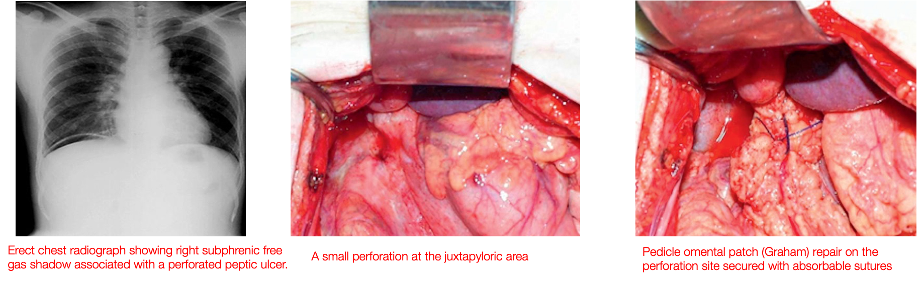 Management: Nasogastric tube to empty the stomach and prevent further peritoneal soiling. IV fluids and broad spectrum antibiotic, followed by surgical closure and omental patch.