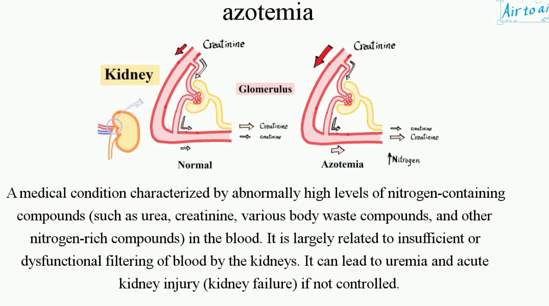 Abnormally high level of nitrogen-containing compounds, such as urea and creatinine, in the blood. These compounds are typically waste products that are normally filtered out of the blood by the kidneys and excreted in the urine. When the kidneys are not functioning properly, these waste products accumulate in the bloodstream, leading to azotemia.