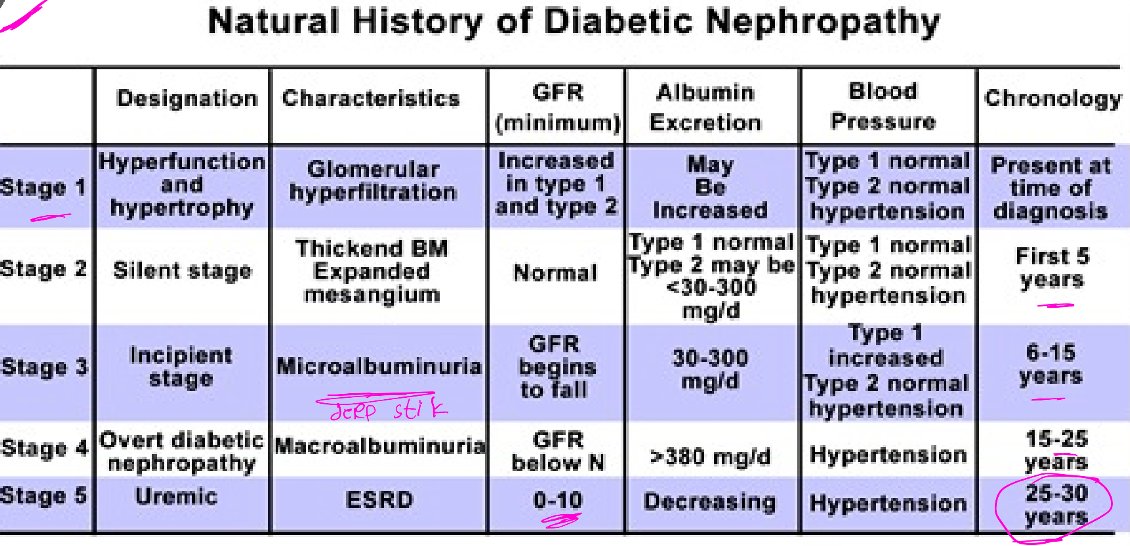 • Starts with microalbuminuria (30-300mg of albumin lost in 24 hrs. urine)