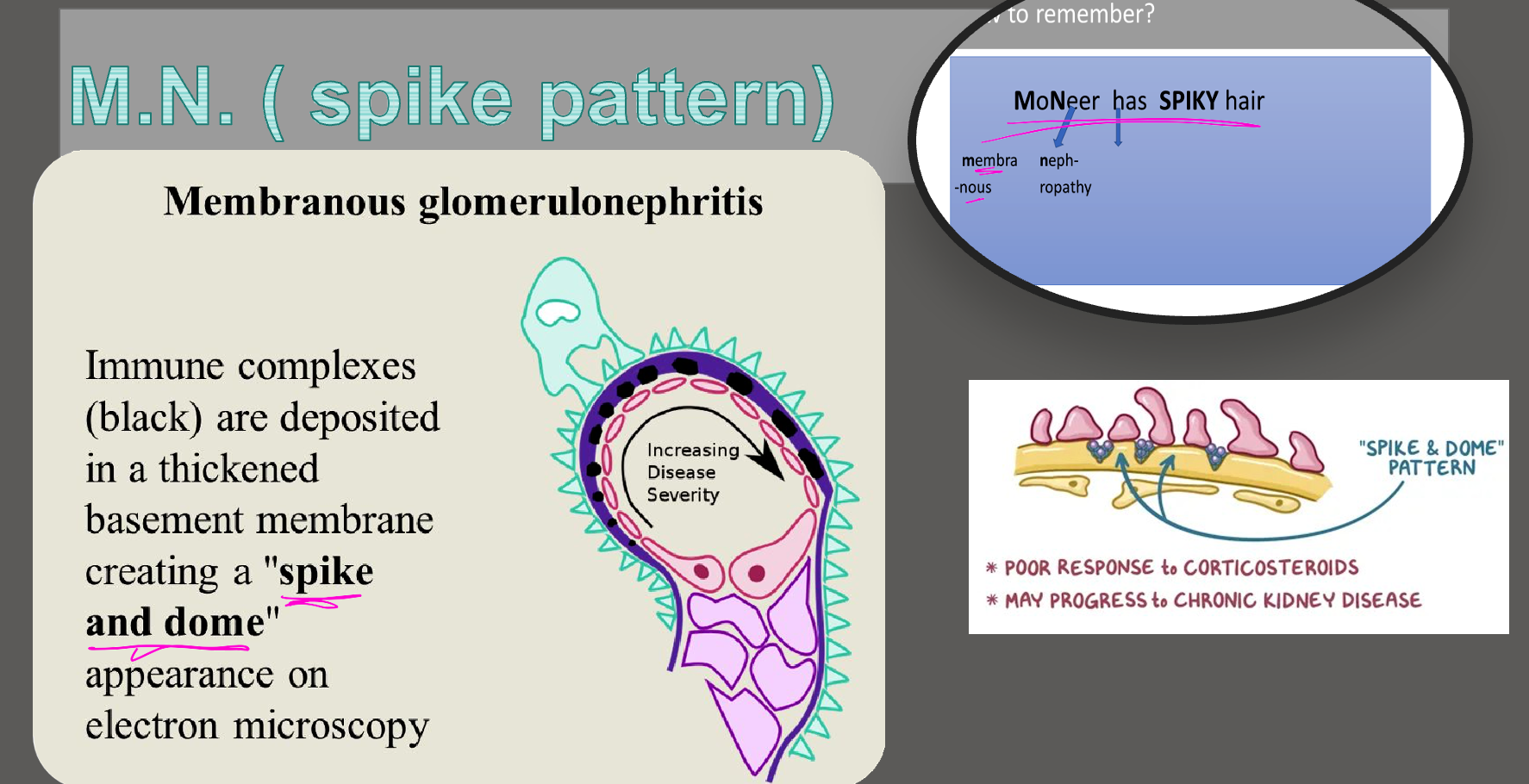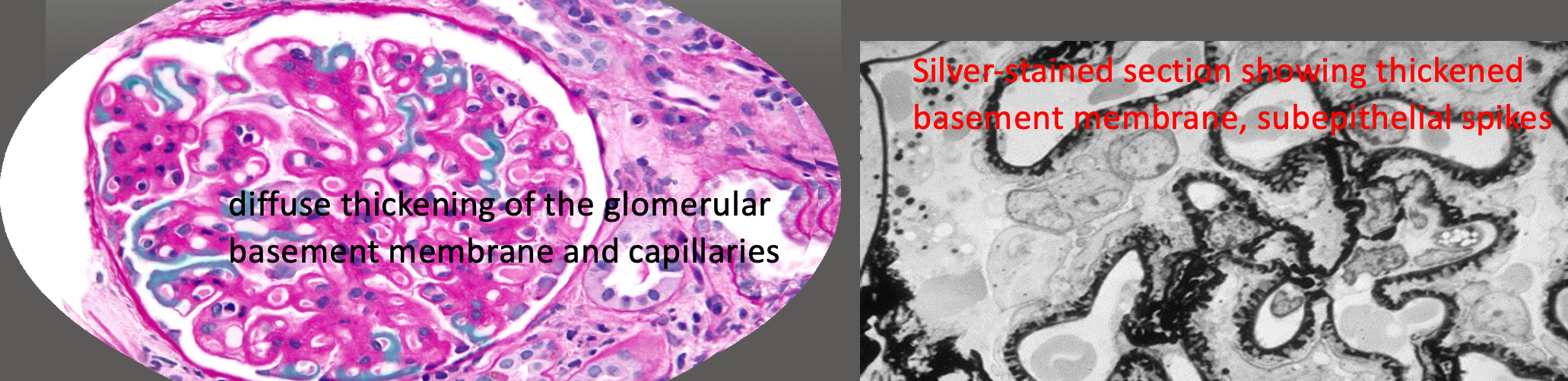 - LM: Thickening of glomerular basement membrane with subepithelial deposits of IgG and C3 (dense deposits) & “spike” formation