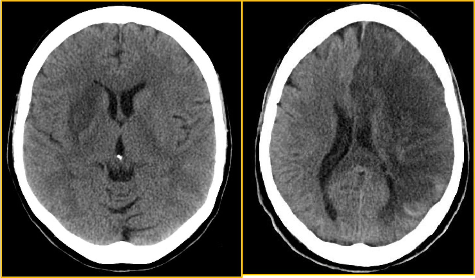- Acute blood appears bright (high attenuation) on CT relative to brain tissue.