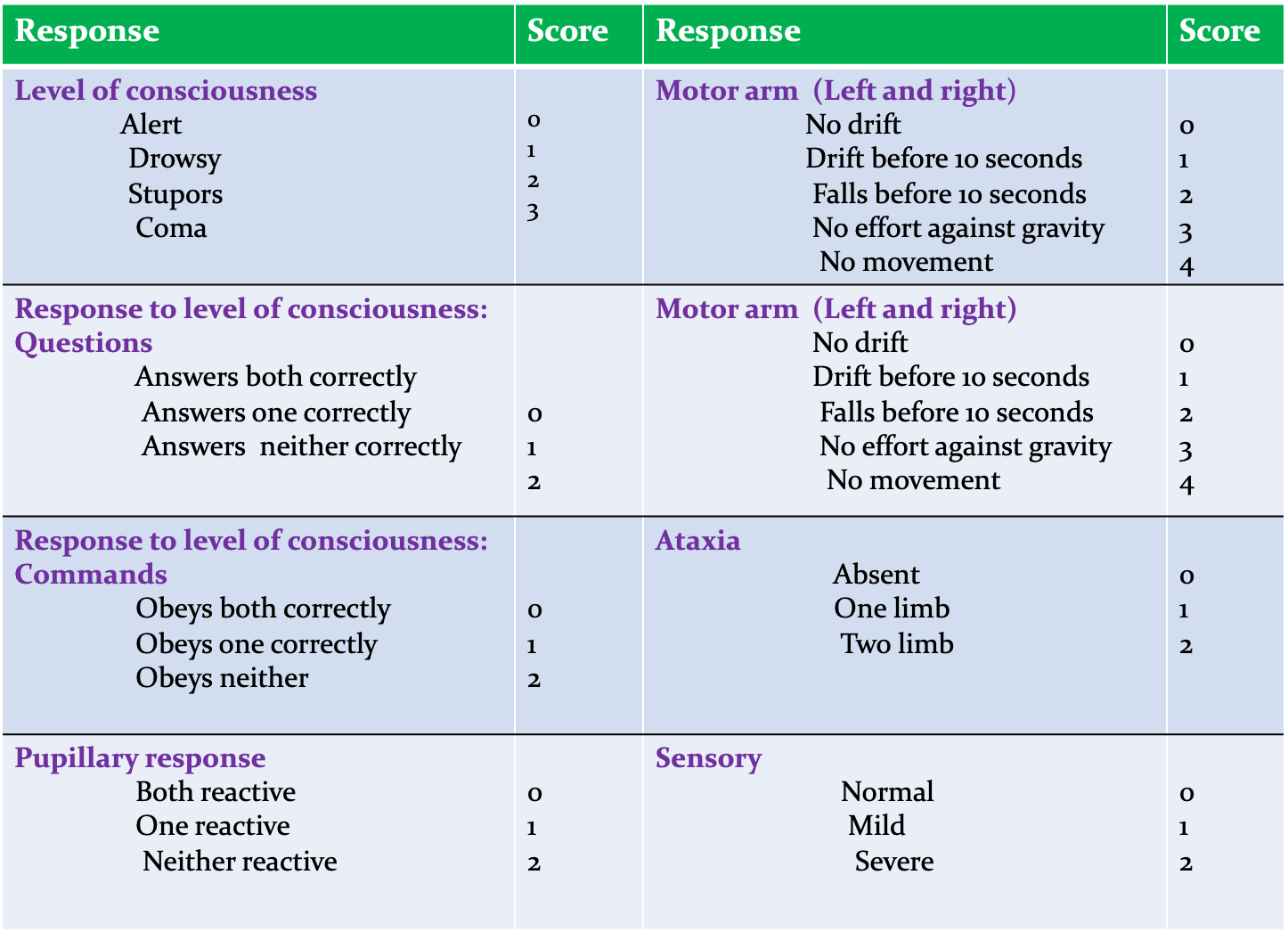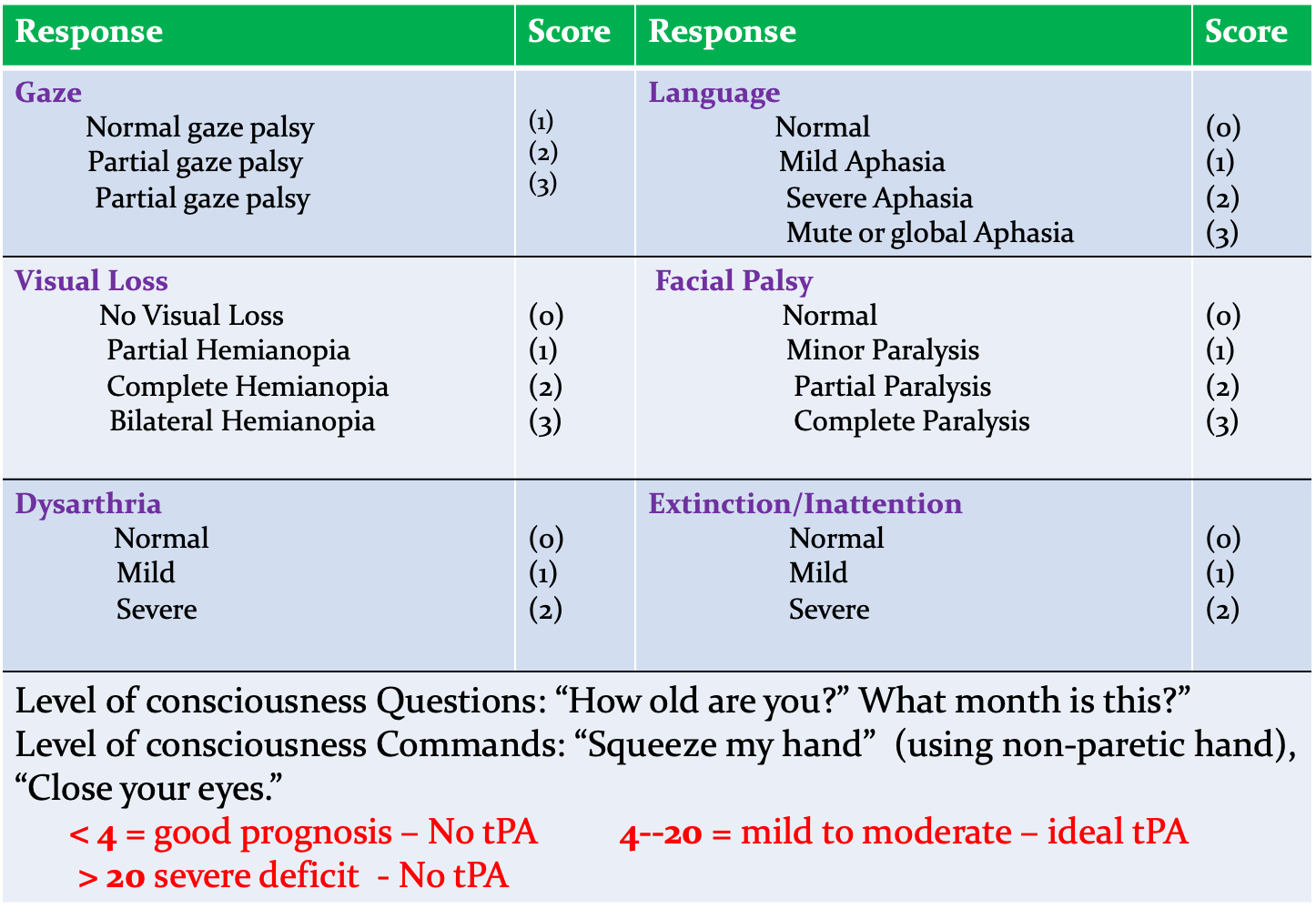 - Establishing stroke severity: (National Institutes of Health Stroke Scale [NIHSS]) to assist in prognosis and therapeutic selection