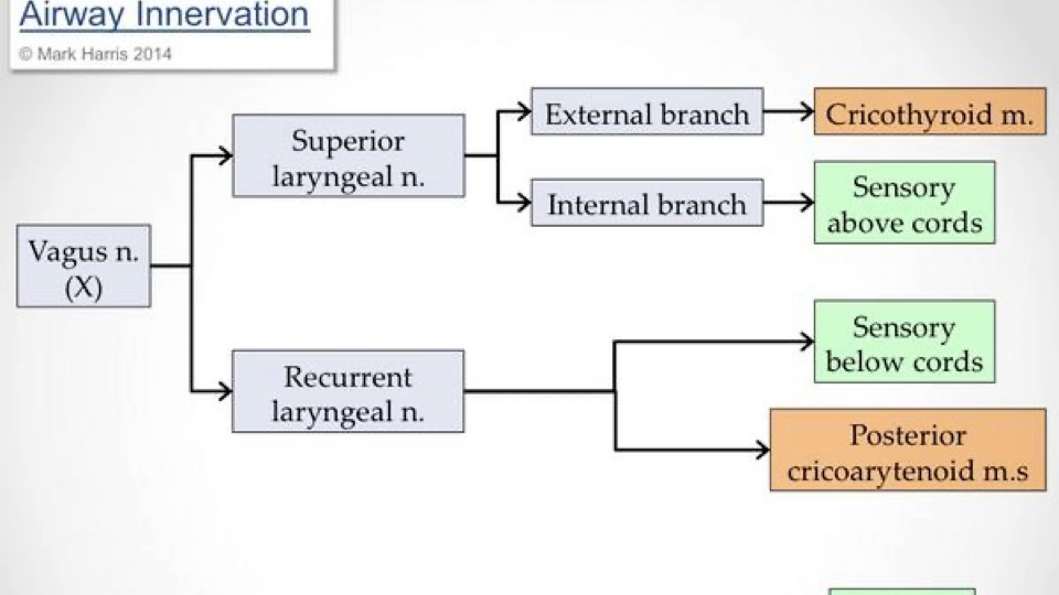 The recurrent laryngeal nerves supply all of the intrinsic muscles of the larynx except for the cricothyroid muscle and any damage to the recurrent laryngeal can result in vocal cord dysfunction. The cricothyroid muscle is innervated by the external branch of the superior laryngeal nerve. Other nerves which may need to be anesthetized for awake fiberoptic intubations include the maxillary branch of the trigeminal nerve which supplies sensory innervations to the nasopharynx and