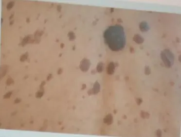 - Usually papular, but may appear macular. Color is variable, wart-like have a stuck-on quality, like a piece of wax. (Example: May be seen on the back of a forty-six-year-old man).