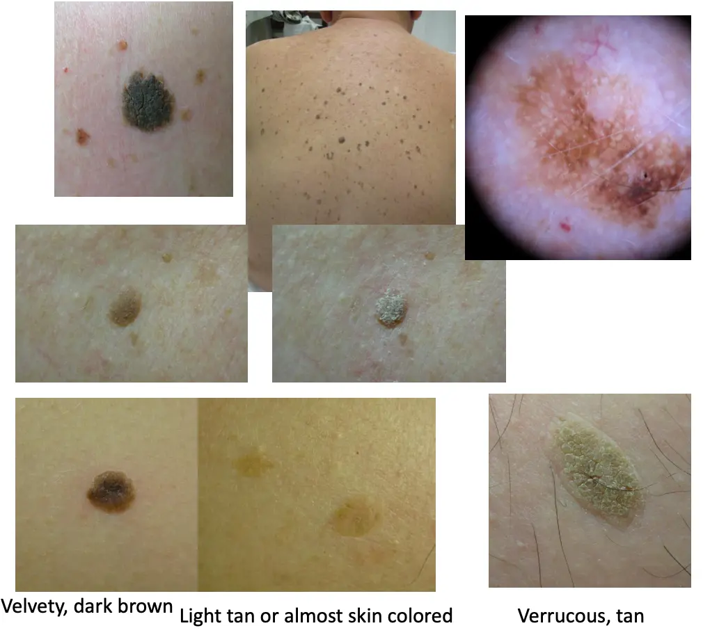 - Benign, but if rapid appearance or in young: red flag for GIT cancer (especially if eruptive, to rule out Leser-Trélat sign)