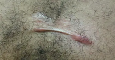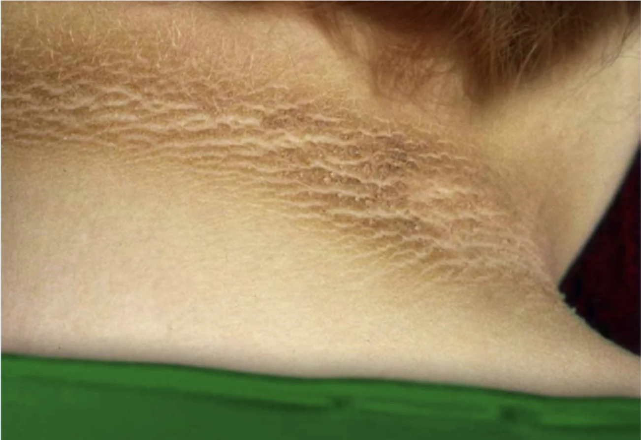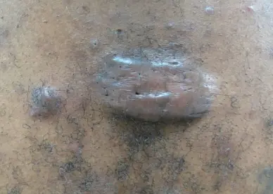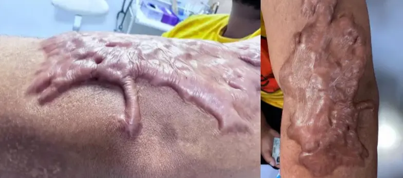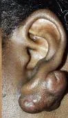 Diagnosis: Keloids Pathophysiology: Fibroblast proliferation Z Complications: Basal cell carcinoma Treatment notes: Intralesional corticosteroid in tight areas. But in large lesions, not recommended (because it will get systemic absorption). So, only inject painful areas.