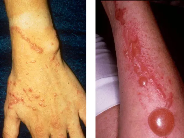 - Presents as eczematous, scaly edematous plaques with vesiculation distributed in areas of exposure, most of the times bilateral.