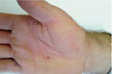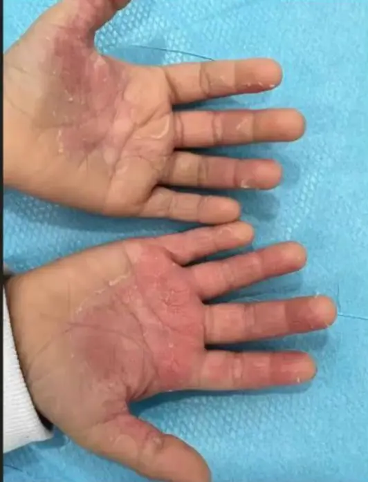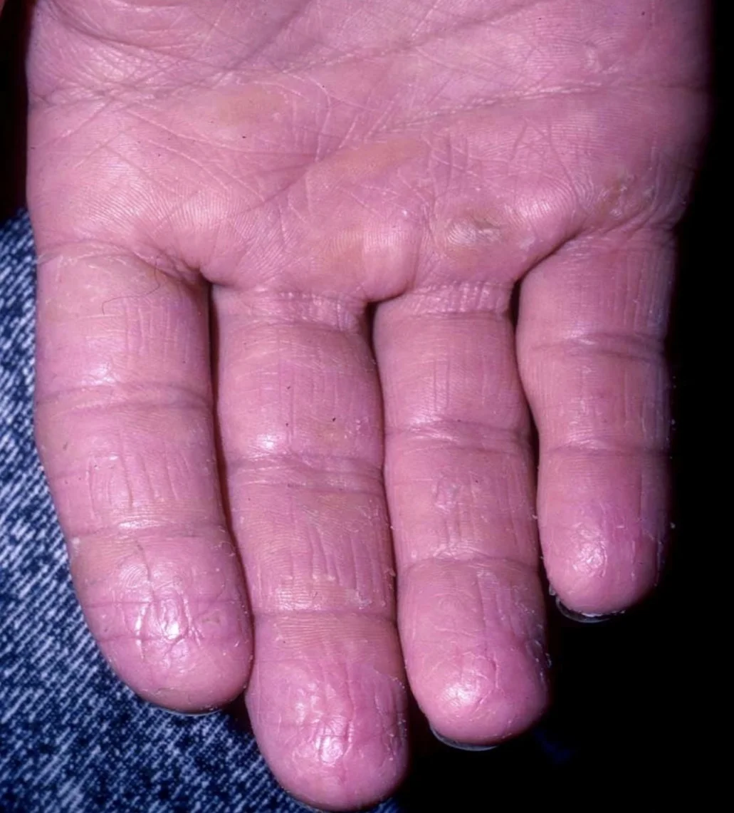 - Describe: Erythema, chapped skin, dryness and fissuring after repeated exposures over time. Pain is a common symptom.