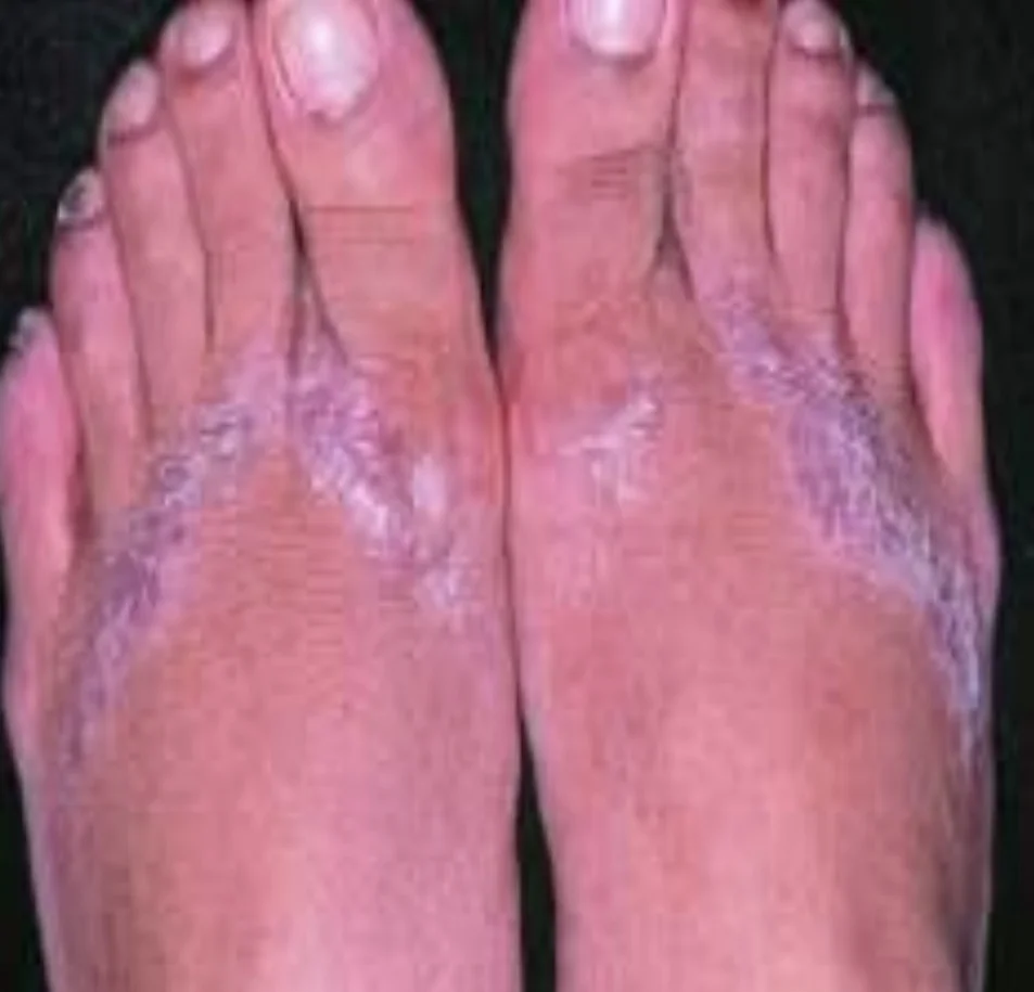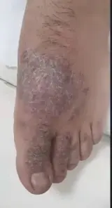 - Ill-demarcated scaly plaques in dorsum of left foot (e.g., related to slippers).
