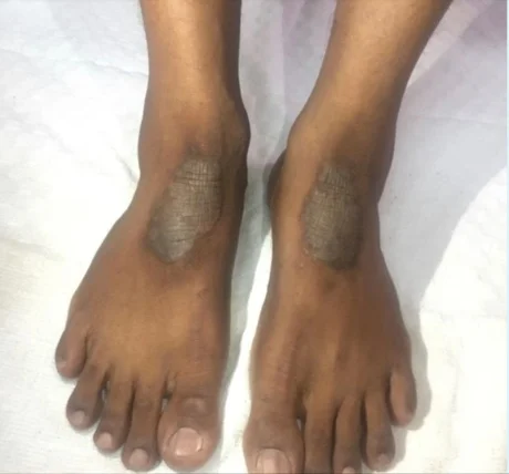 A 46-year-old electrical technician man presented with chronic bilateral pruritic plaques on the dorsal feet (look to attached image) for 10 years throughout this period the condition waned and waved.