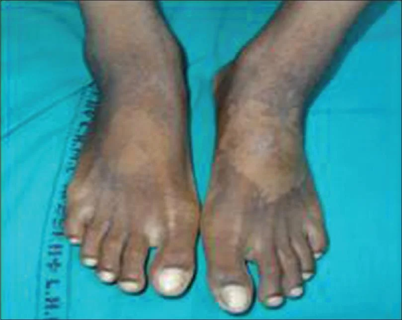 Clinical Findings: Bilateral lichinified plaques with fissures are observed in the dorsum of feet. (Note: The image in the exam was more clear and fissures were visible).