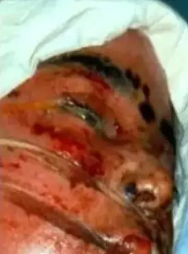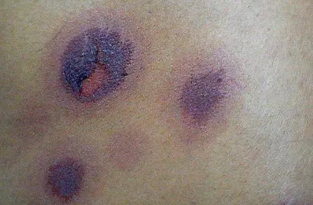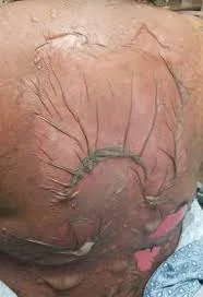 - Begins as an erythematous, edematous plaque with a grayish center or frank bullae, then progresses to dark, post-inflammatory pigmentation.