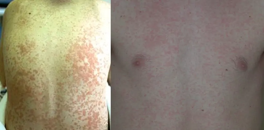 - Clinical Presentation: rash and fever (87%), classically erythematous follicular papules and pustules, but may also include bullae or purpura.