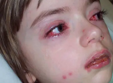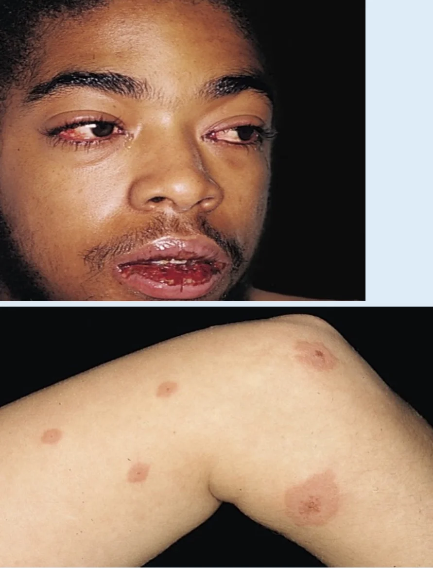 A 16 Y/O boy presents with a four-day history of oral erosions, eye pain, and cough. Exam reveals scattered targetoid plaques on the trunk (less than 3% body surface area) and superficial erosions on the lips and buccal mucosa with hemorrhagic crusting. widespread + oral Involvement
