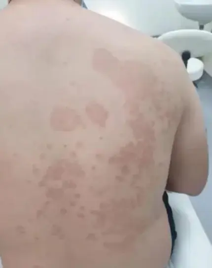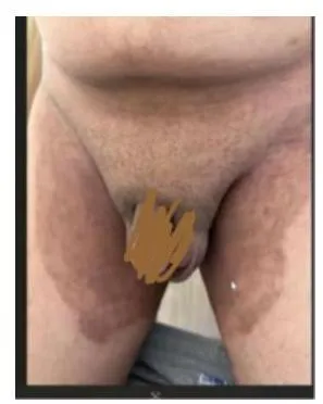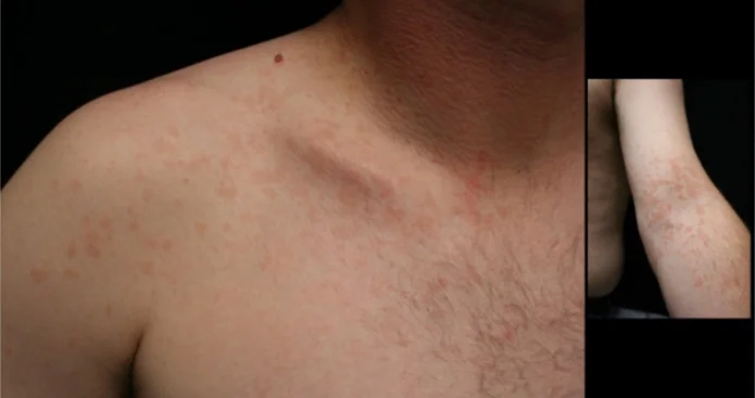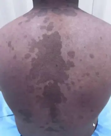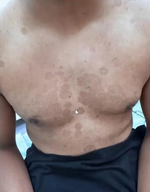 - Multiple pink to tan-colored, round, flat lesions with sharp, irregular borders and varying sizes on his upper chest, back, and flexures of the arms.