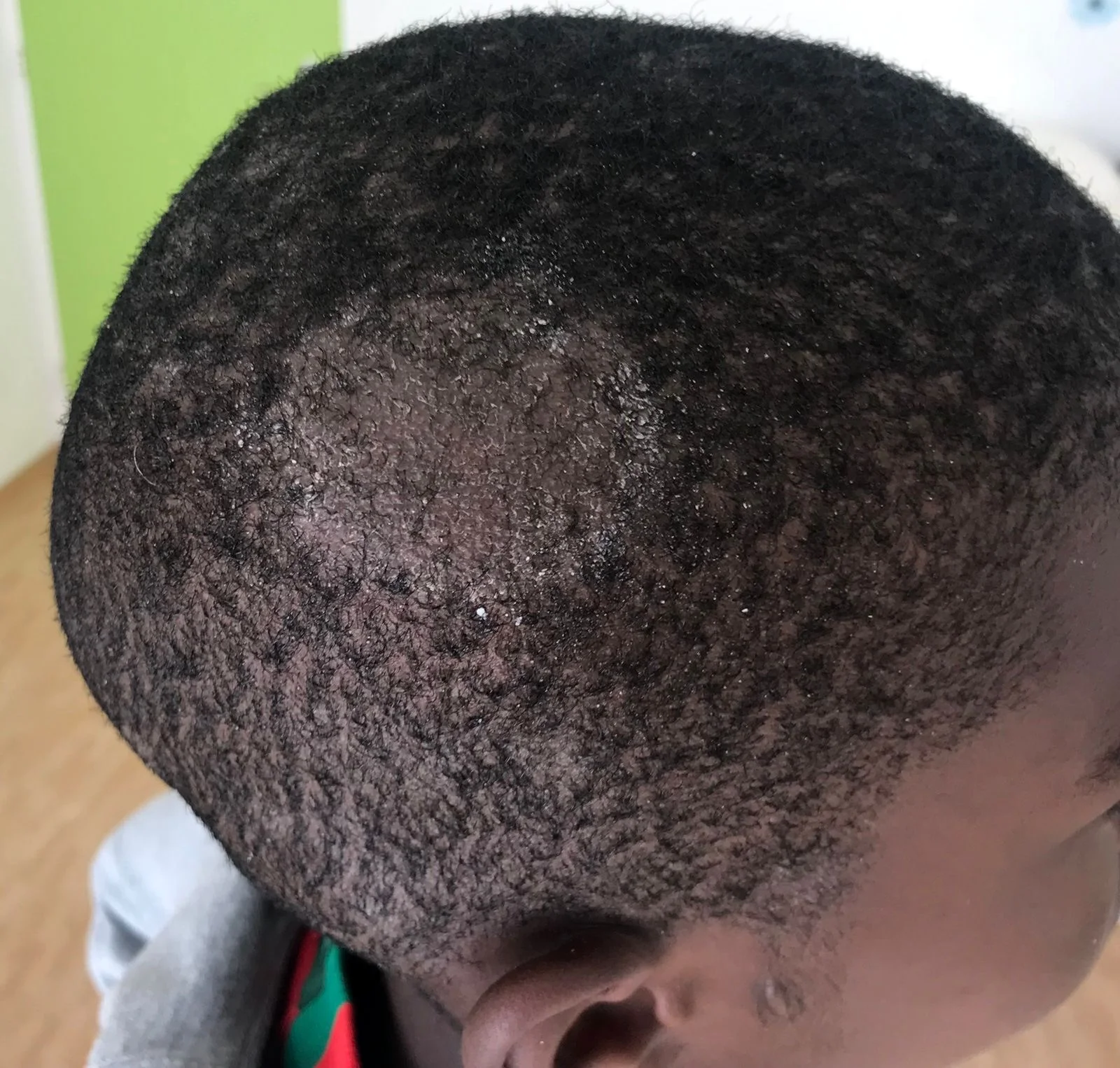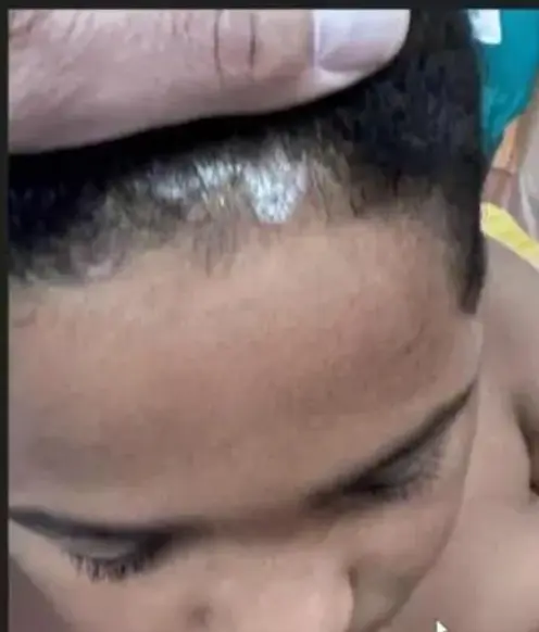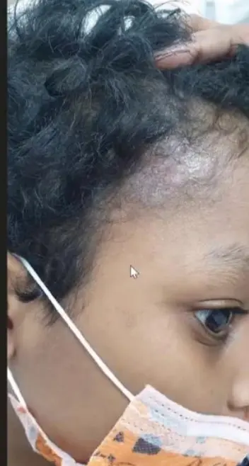 - Child, erythematous lesion within hairline.