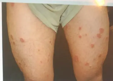 A 35 – year single unemployed man presented to the dermatology unit because of itchy erythematous patches, he tried Vaseline ointment which induced partial relief. His suffering had been started 3 years ago when he developed a similar condition three times on different body sites, that respond well to some topical treatment at one of them, he couldn’t remember it now, but this time it is more severe and numerous.