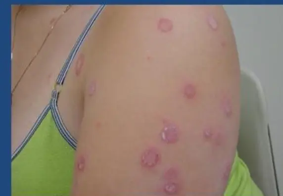 - A 7 Y/O boy with these skin lesions on shoulder and abdomen. He gives a history of contact with cats.