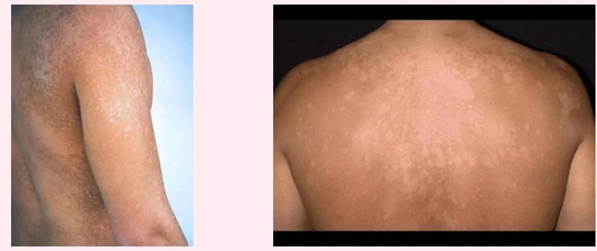 - Multiple hypopigmented, well-defined macules and patches with fine scaling on the upper back.
