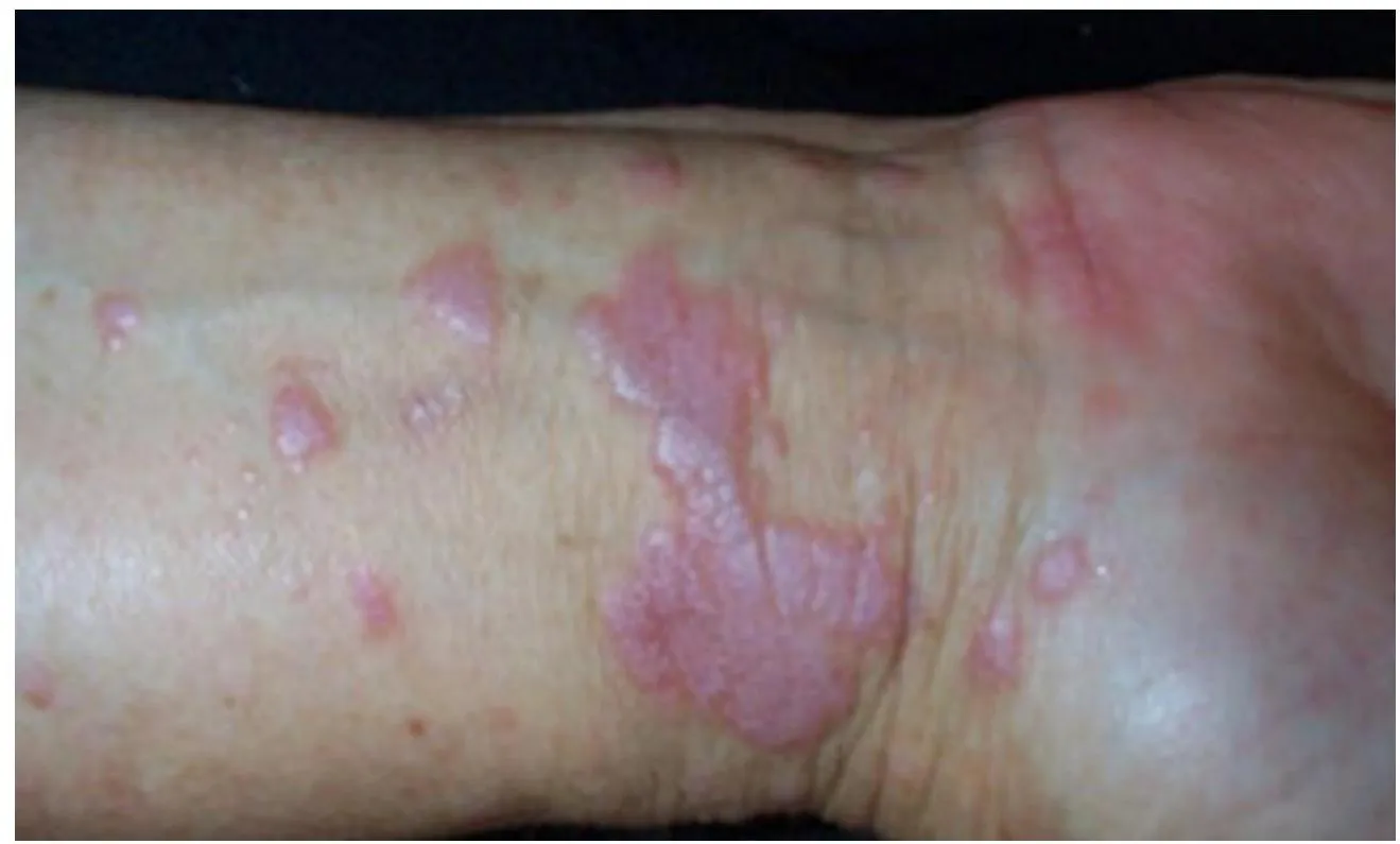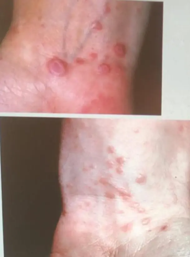 Typical itchy/pruritic papules, demarcated by skin lines on the extremities especially the volar aspects, particularly wrists. Patients may be 20-35 years old. Oral cavity may show whitish changes. History of drug intake like chloroquine may be present.