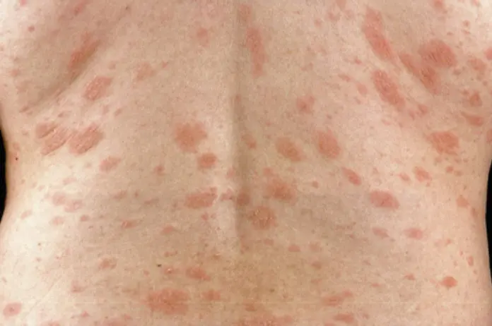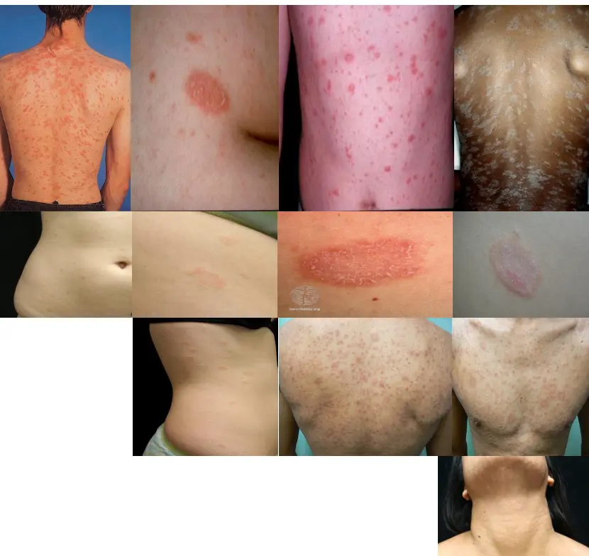 Describe? The skin lesions resemble a ‘Christmas tree’ pattern. The patch is larger, redder, scalier and rounder than the later lesions, and can be an annular erythematous 2-10 cm patch anywhere on the body, with peripheral scaling and central clearing.