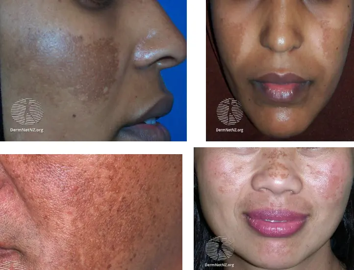 - bilateral, blotchy, symmetrical brownish facial pigmentation.