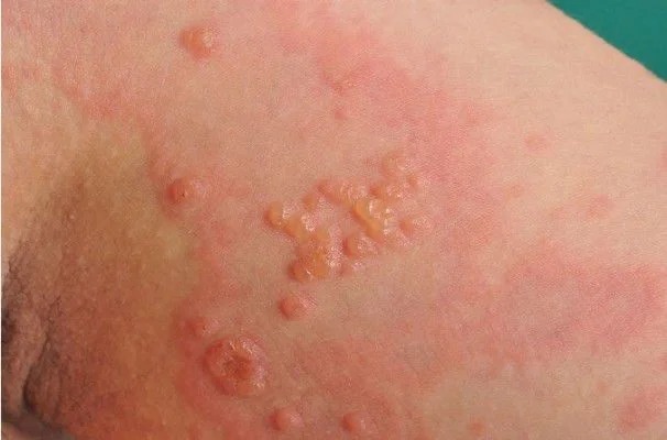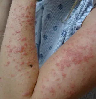 - Widespread pruritic eruption (papules, vesicles, bullae)