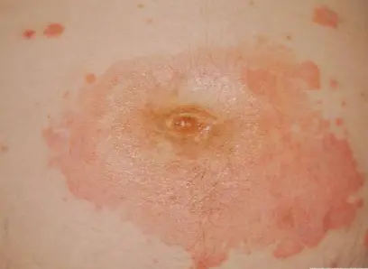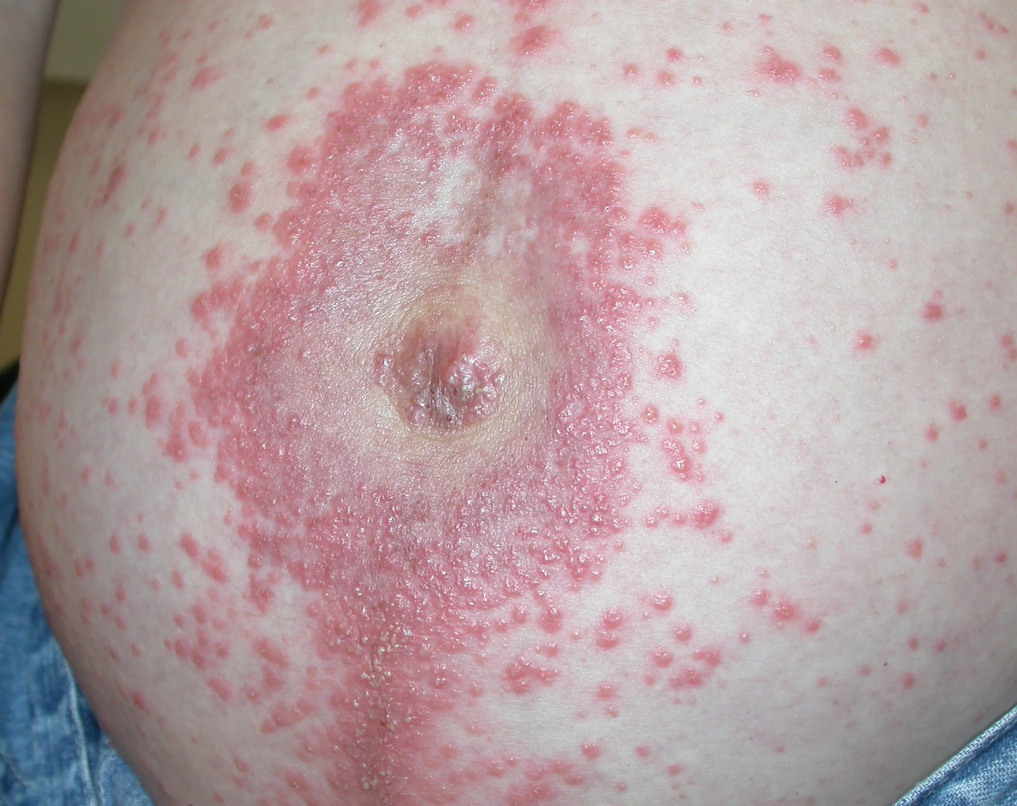 - Often involves the umbilicus (a key differentiating feature from PUPPP, which usually spares the umbilicus)