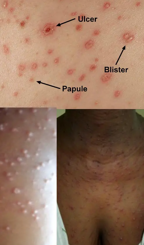 - A 4-year boy developed a generalized vesicular eruption preceded by 3 days of fever and malaise; the eruption started from the face spread down to involve the whole body. The boy is restless, scratching the vesicles.