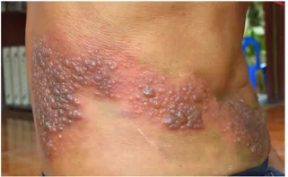 - 65 year old man developed a band-like eruption on the left side of his chest. The lesion started as erythematous painful vesicle followed by papule that rapidly blistered. They first appeared in the back and expanded anteriorly till the mid-line.
