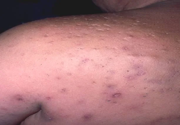 Moderate comedonal acne without evidence of scarring. ▪ Note the mild post- inflammatory hyperpigmentation.