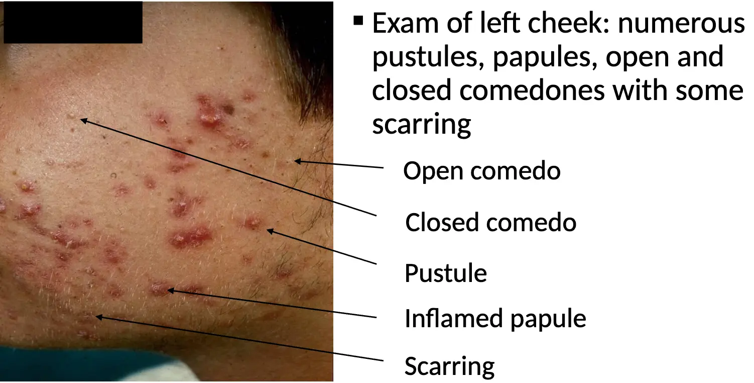 Exam of left cheek: numerous pustules, papules, open and closed comedones with some scarring