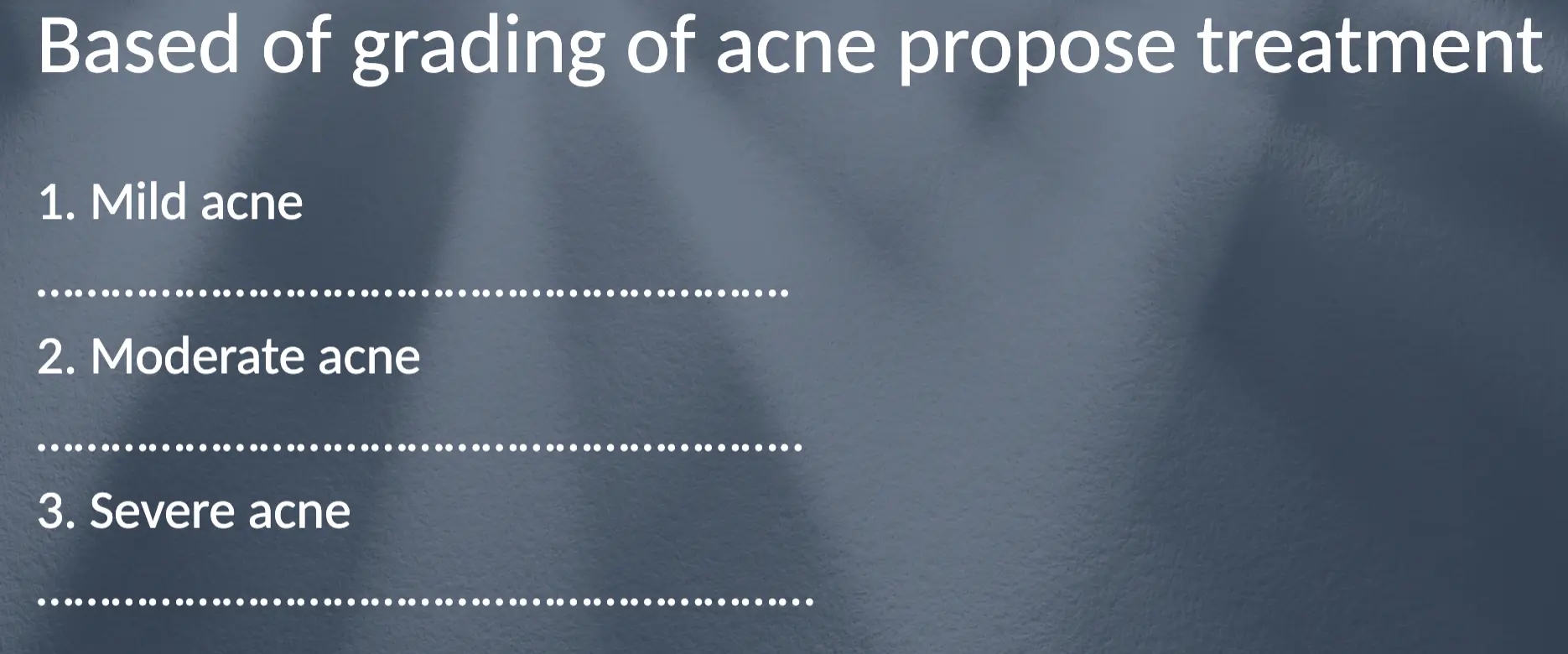 - How would you describe Jim’s skin exam? a. Mild comedonal acne without presence of scarring b. Mild inflammatory acne without comedones c. Moderate mixed comedonal and inflammatory acne with presence of scarring d. Moderate mixed comedonal and inflammatory acne without presence of scarring