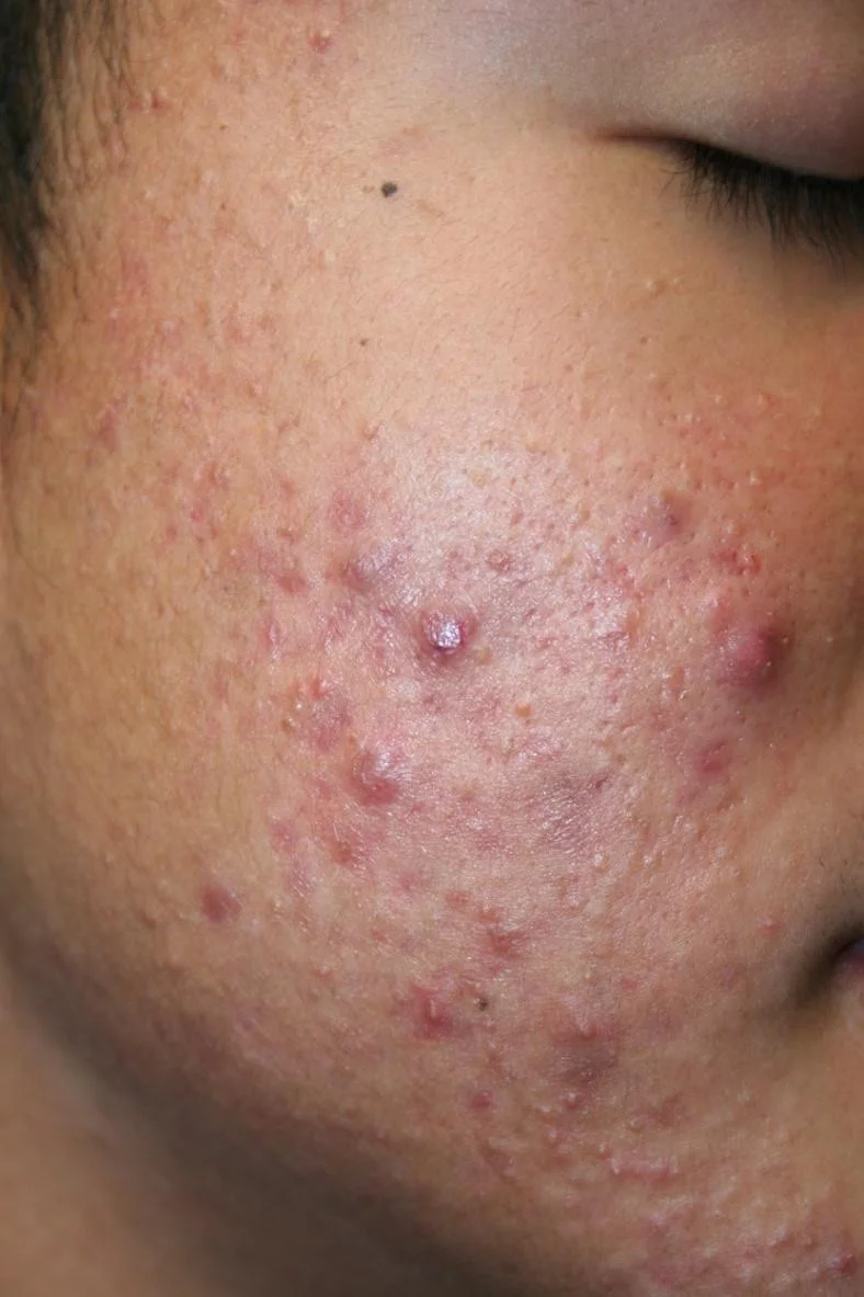HPI: Yasir is an 17-year-old healthy teenager who presents to his primary care physician with “pimples” on his face for the last 2 years. He reports a daily skin regimen of aggressive facial cleansing with a bar soap during his morning shower.