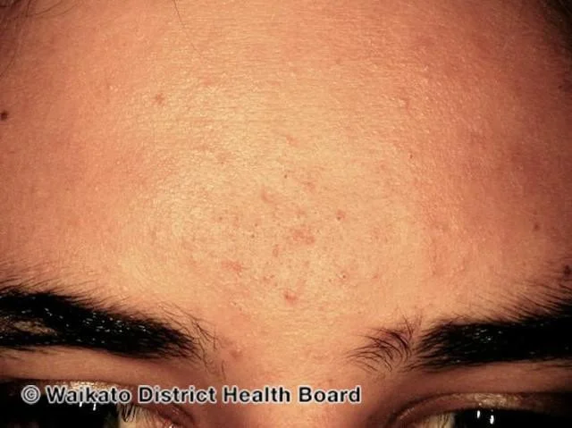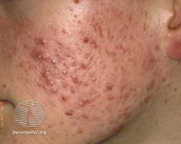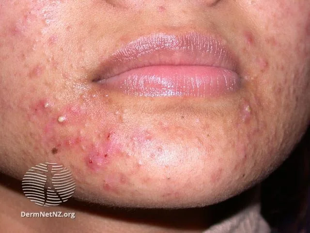 Erythematous macules (red marks from recently healed spots, best seen in in fair skin)