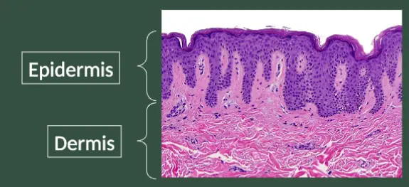 - Dermis; lies below the epidermis, and consists primarily of fibroblasts, collagen, and elastic fibers.