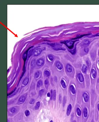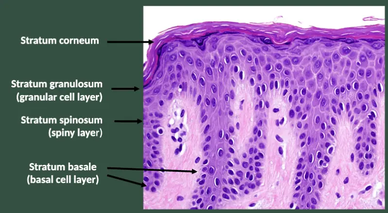 - Thick outer layer of flattened keratinized non-nucleated cells (corneocytes) provide a barrier against trauma and infection.
